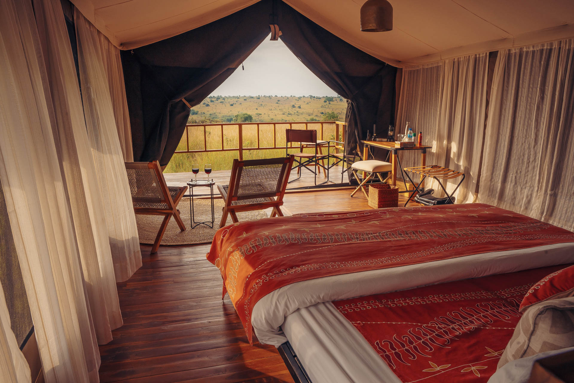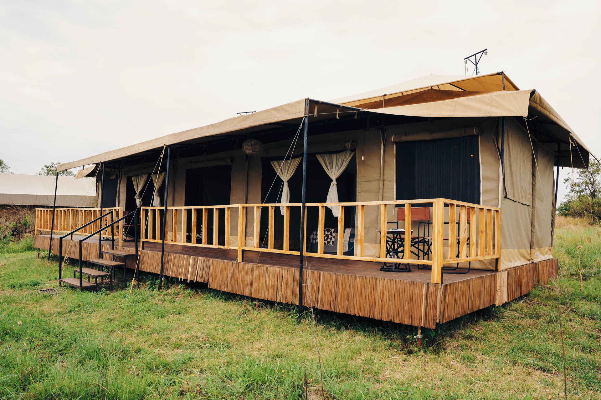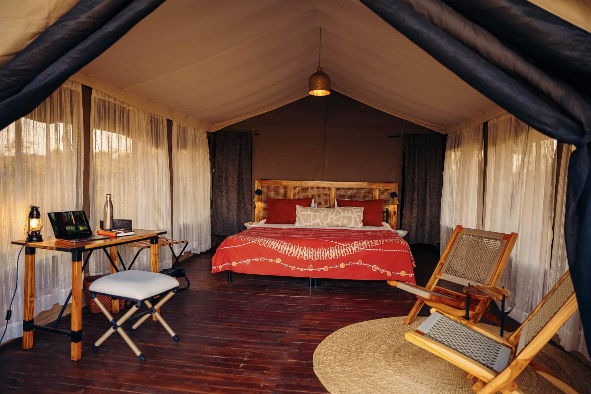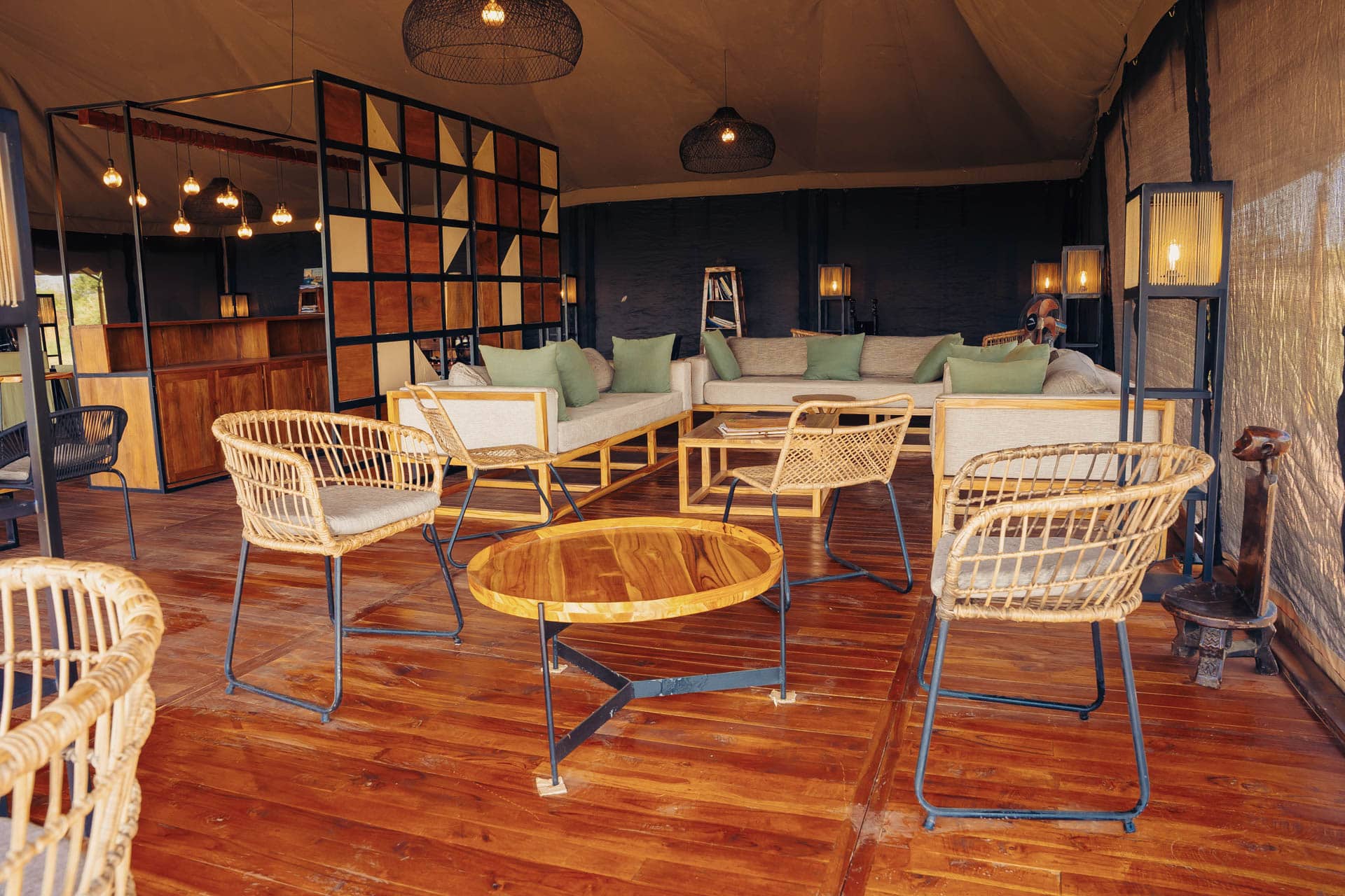 Das Nyikani Migration Camp besteht aus 10 Zelten und einem Familienzelt, die alle mit eigener Terrasse, en-suite Badezimmer mit Spültoilette und fließendem Wasser ausgestattet sind. Die Dusche ist eine traditionelle Bucket-Shower, in die warmes Wasser befüllt wird. Alle Möbel wurden in Arusha entworfen und produziert. Das Camp wird mit Solar betrieben, besitzt dennoch einen Generator als Backup. Im Gemeinschaftszelt befindet sich das Restaurant und ein Loungebereich mit einer kleinen Bibliothek. Wenn sich der Tag dem Ende neigt, trifft man sich am Lagerfeuer, um sich über die Erlebnisse des Tages auszutauschen und den Abend ausklingen zu lassen.