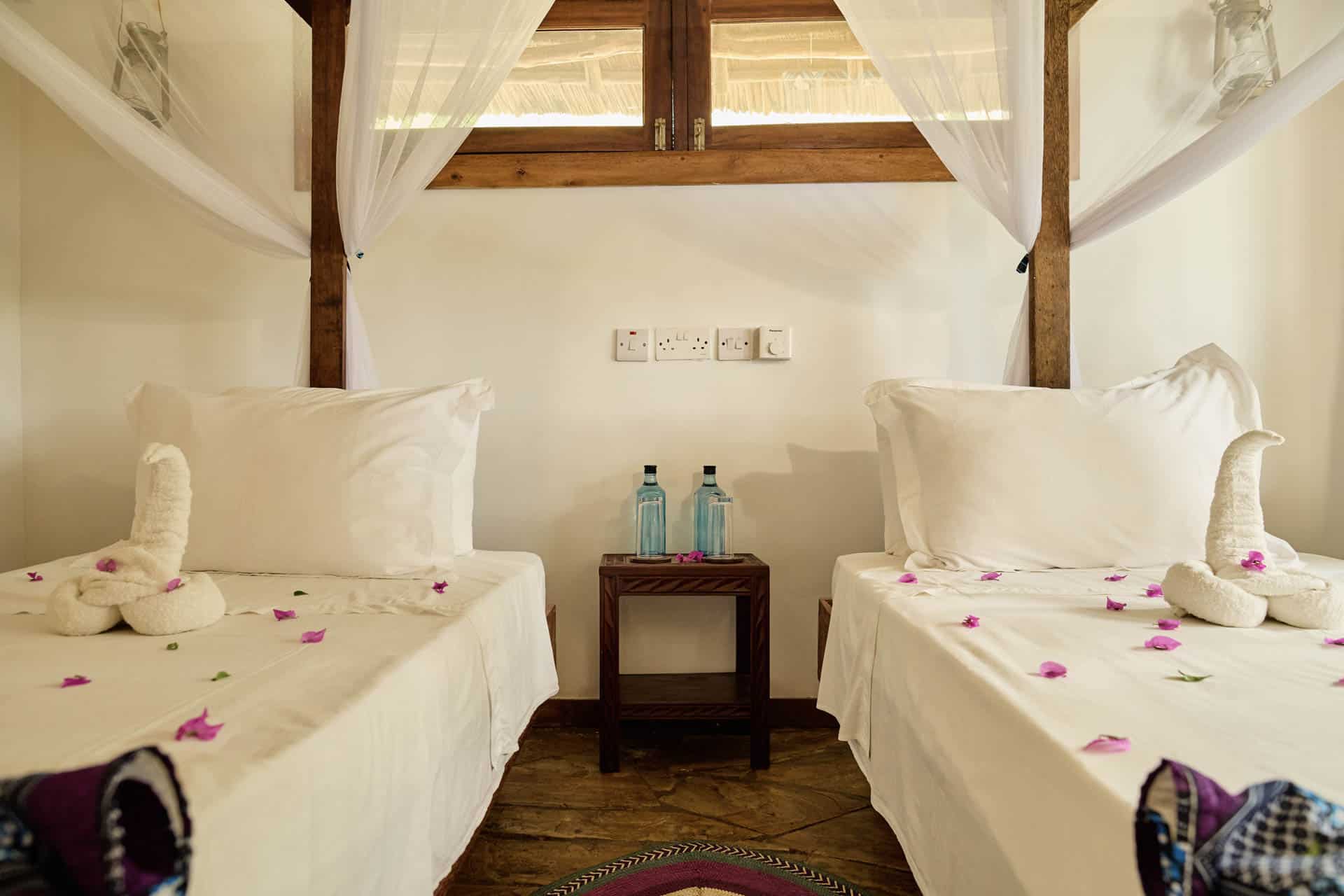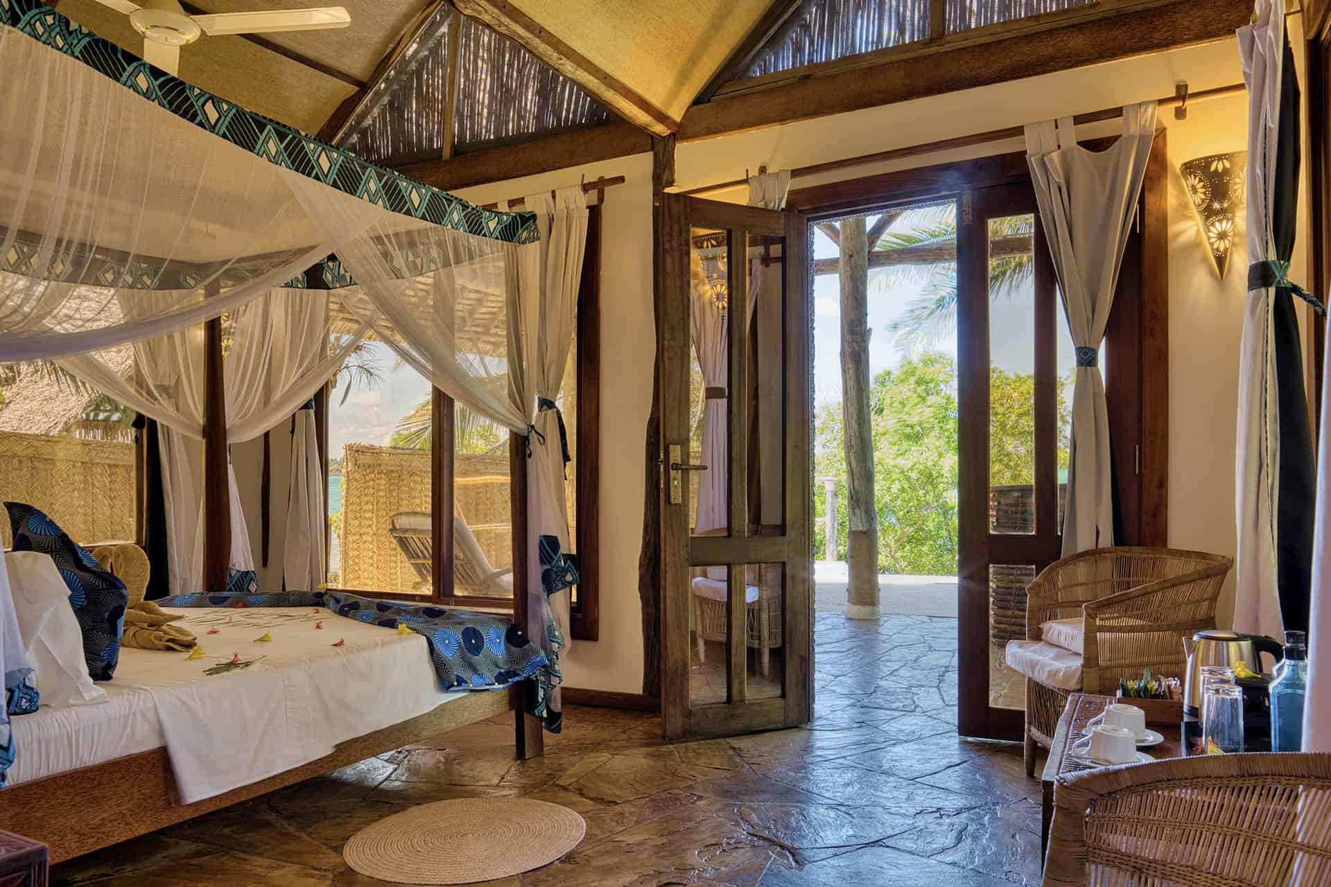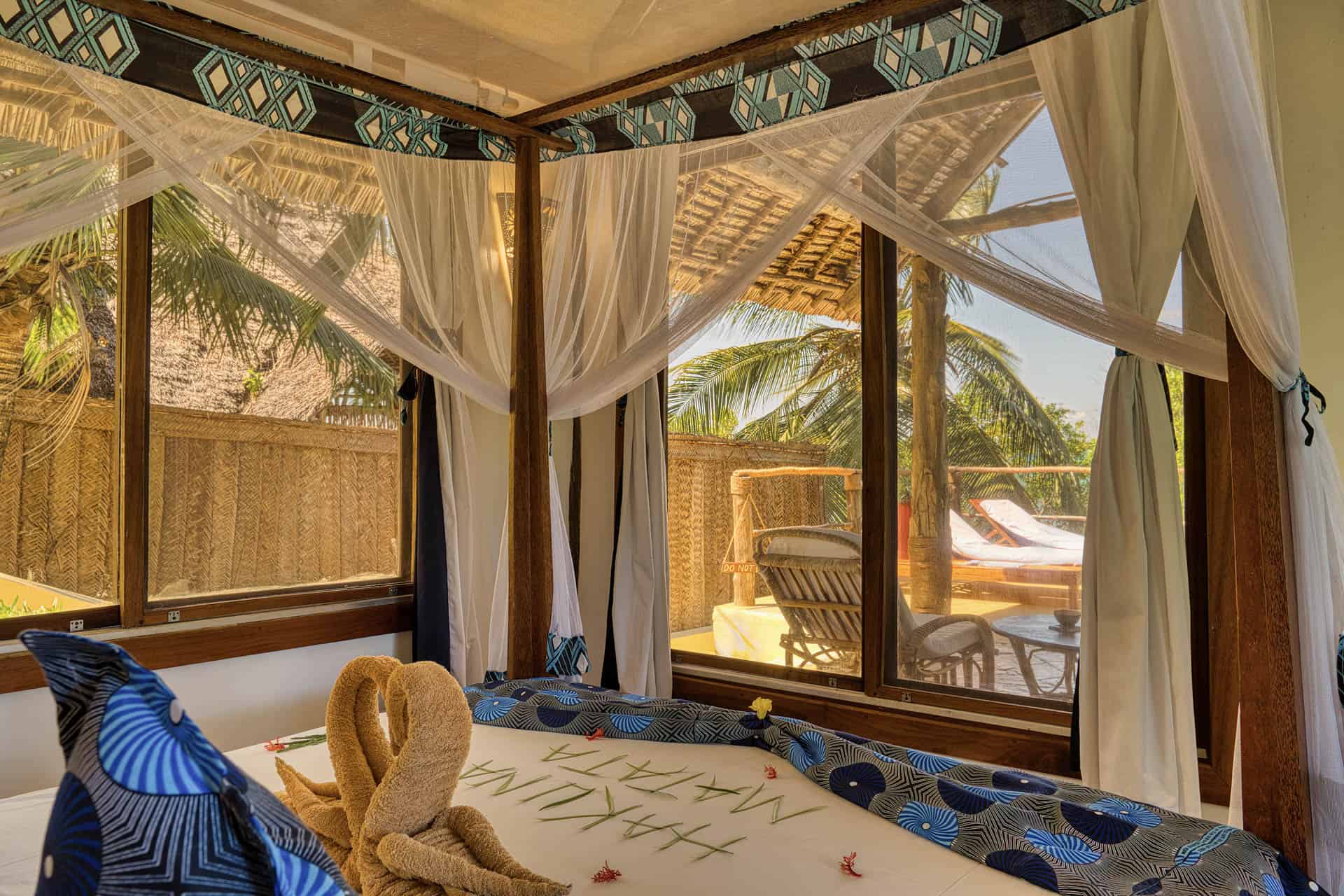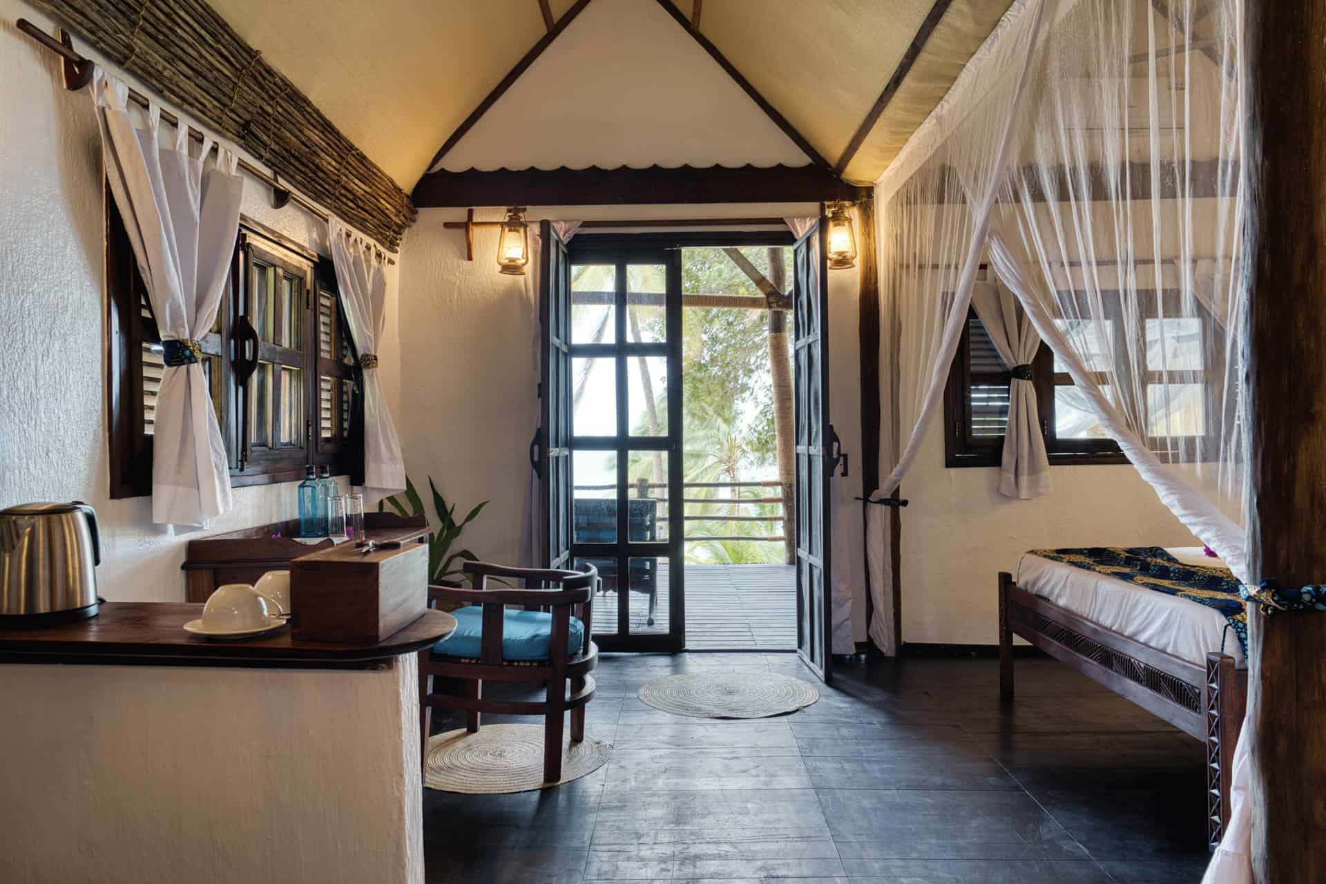 Die zwölf Bungalows befinden sich in einer traumhaften Hanglage, eingebettet im grünen Kokospalmenwald, und bieten alle einen herrlichen Meerblick. Die Zimmer sind stilvoll mit handgeschnitzten und antiken Möbeln ausgestattet. Auf den großzügigen privaten Terrassen laden traditionelle Zanzibaribetten, Stühle, Tische und ein gemütlicher Sessel zum Verweilen ein. Jedes Zimmer verfügt über ein großes Badezimmer, Deckenventilatoren im Zimmer und auf der Terrasse sowie WLAN.
