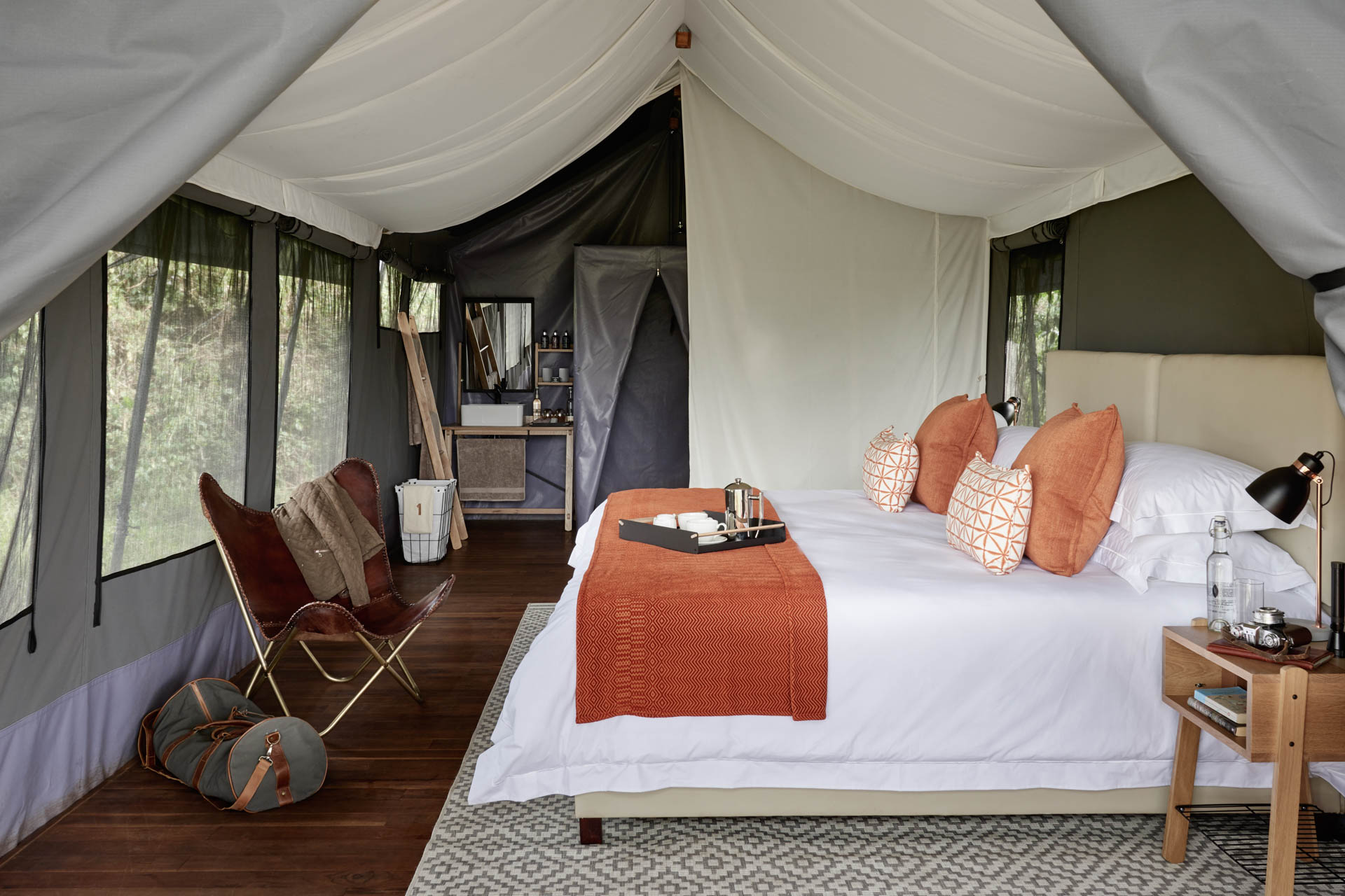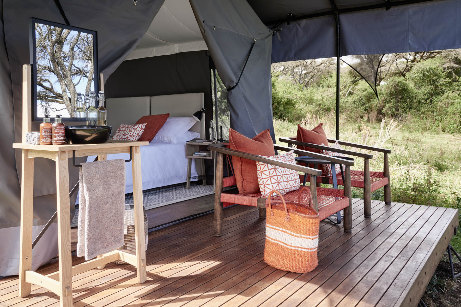 Die luxuriösen Zelte sind großzügig gestaltet und verbinden klassisches Safaridesign mit modernen Annehmlichkeiten. Warme Naturmaterialien, hochwertige Stoffe und stilvolle Details schaffen ein elegantes, aber naturnahes Ambiente. Private Veranden bieten Ausblicke in den Akazienwald, in dem regelmäßig verschiedene Antilopenarten und eine bunte Vogelwelt zu beobachten sind.