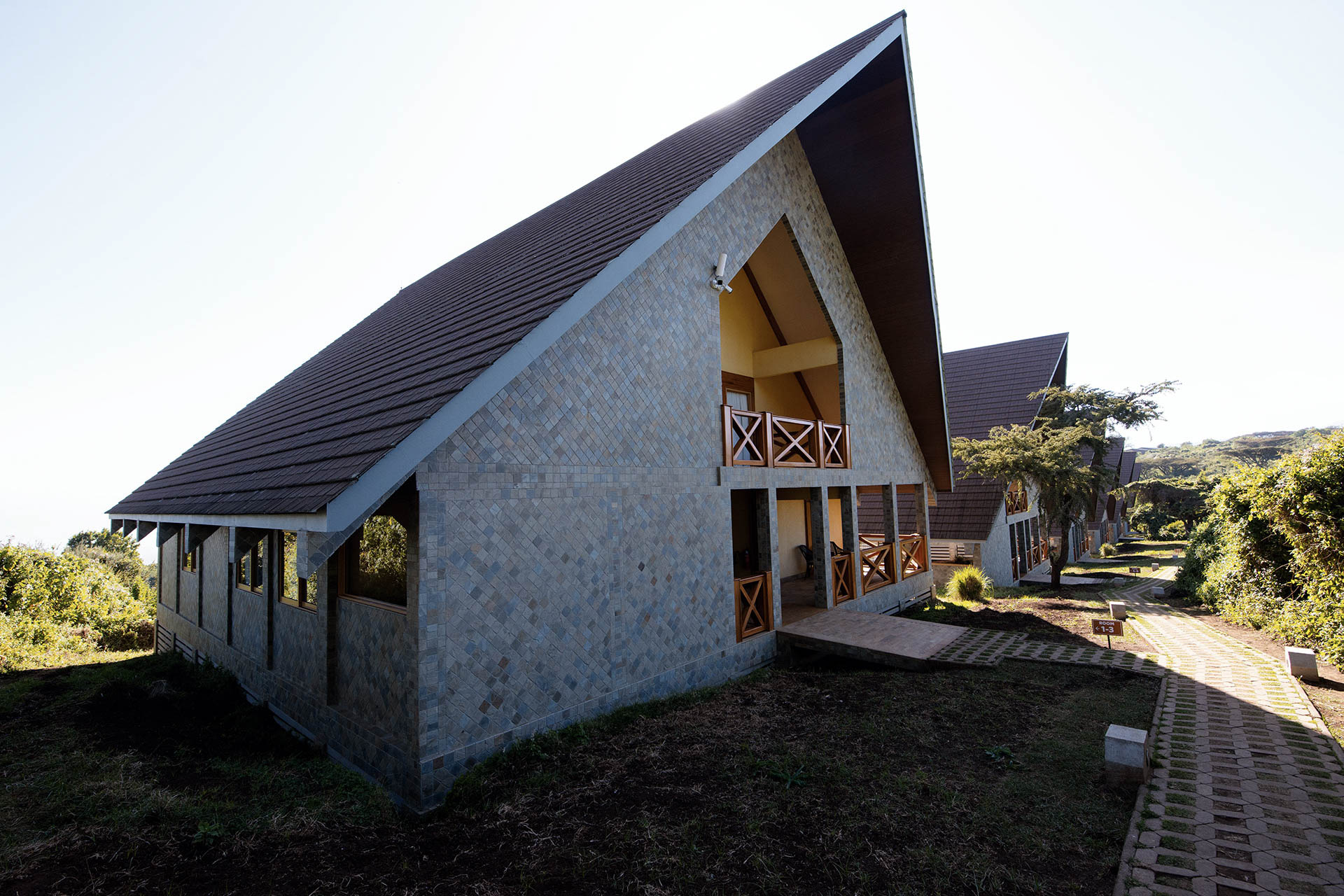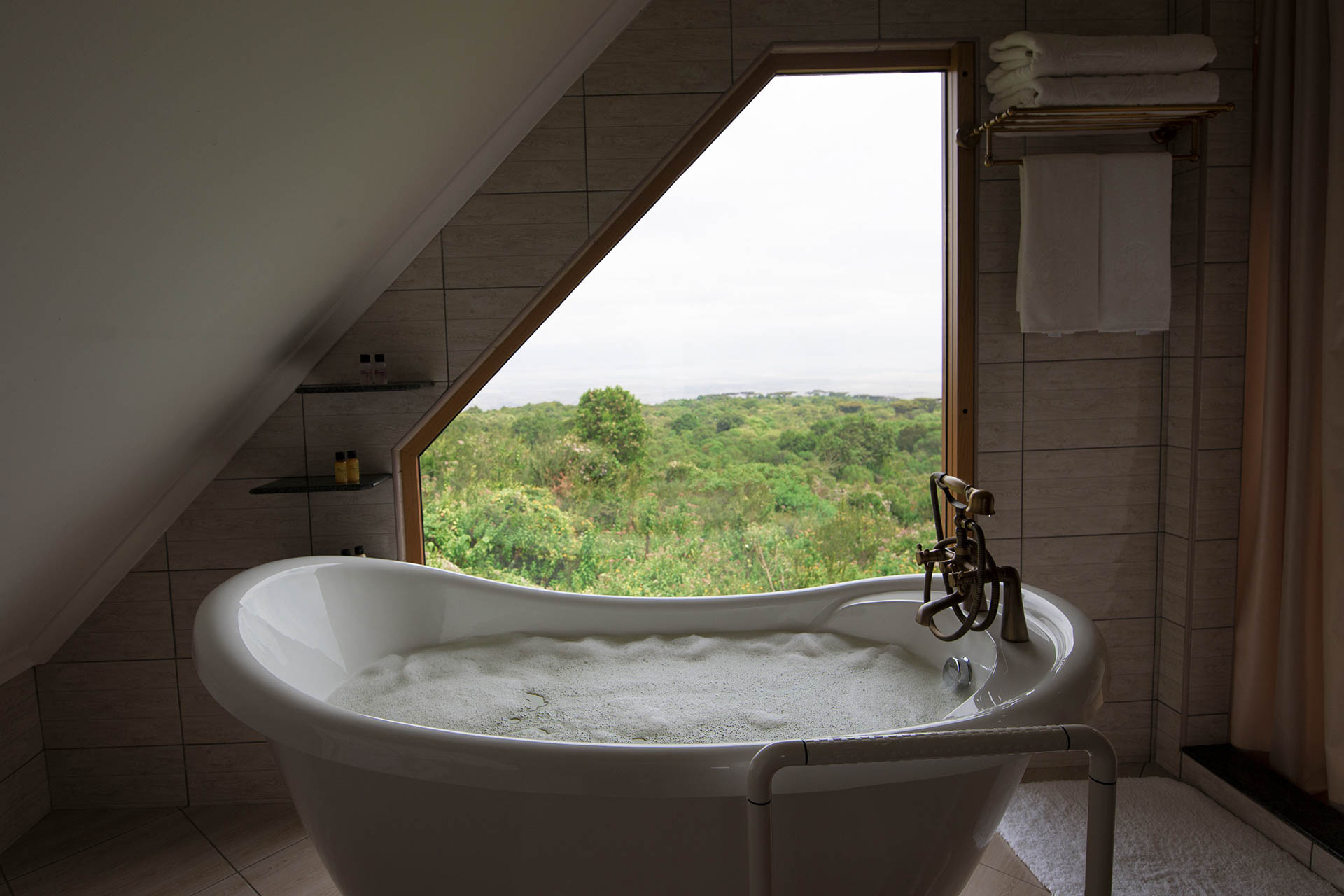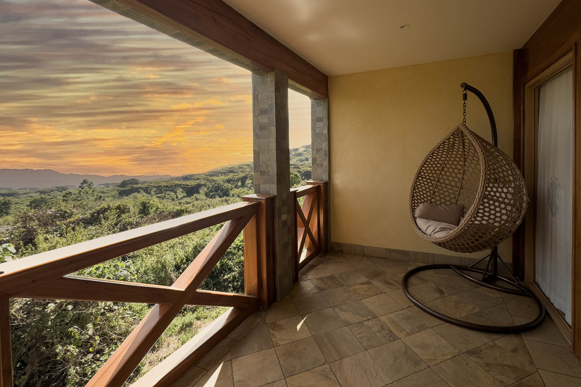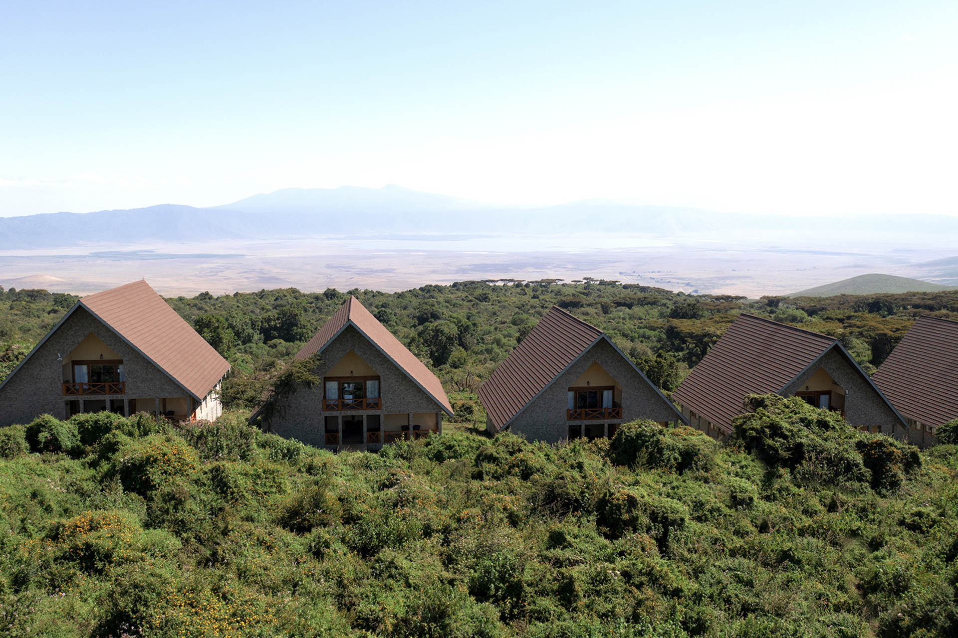 Die Zimmer sind mit Teakmöbeln hochwertig ausgestattet und auf Komfort ausgelegt. Große Fenster öffnen den Blick in den Ngorongoro Krater und die grünen Hügel des Hochlandes. Innen dominieren klare Linien und warme Farbtöne, die eine angenehme Atmosphäre schaffen. Die öffentlichen Bereiche bieten ausreichend Platz zum Entspannen und eignen sich gut, um nach einem Safari-Tag die Aussicht zu genießen.