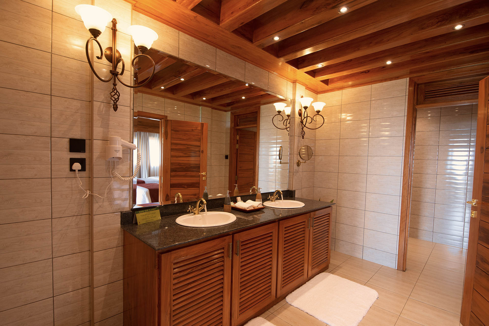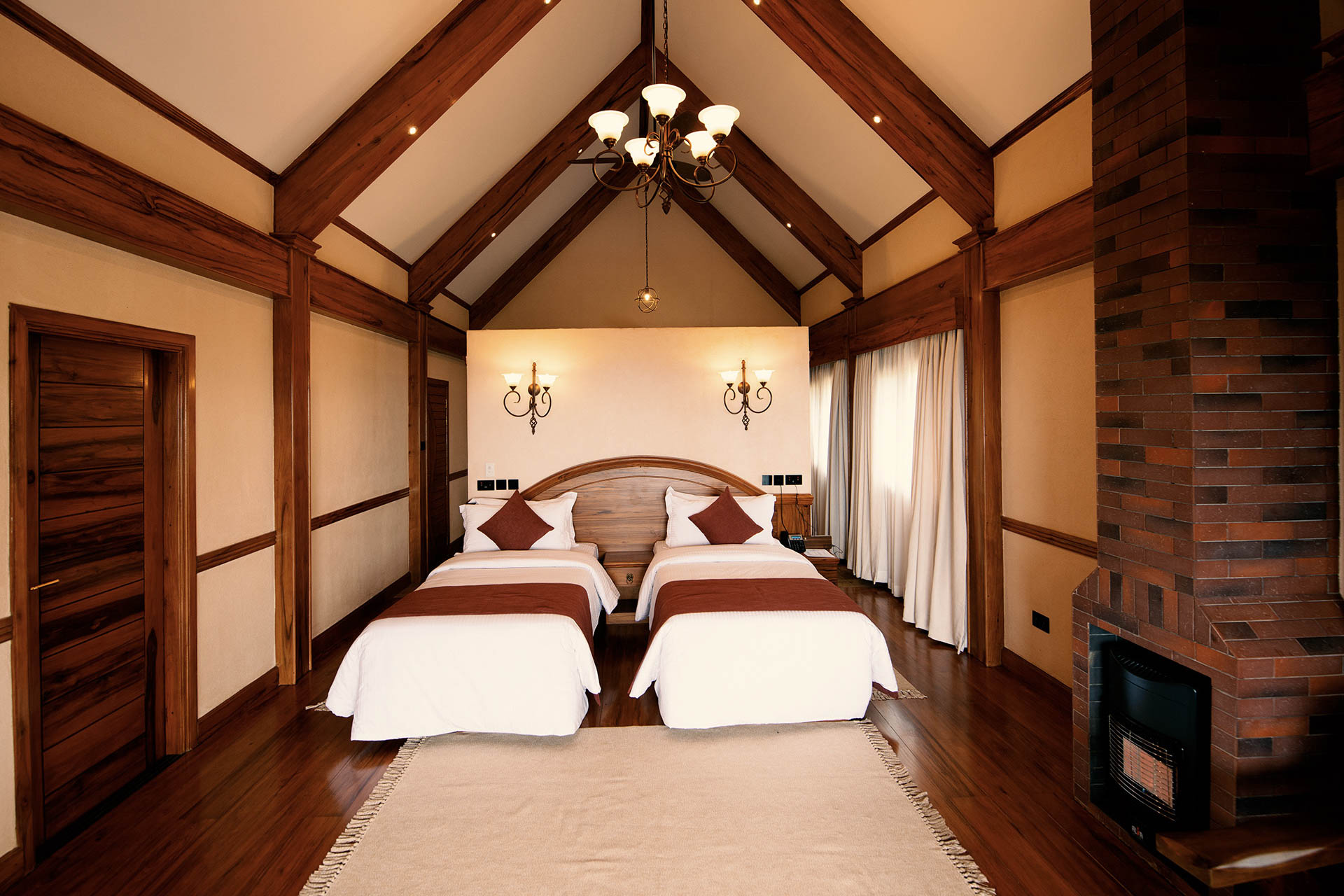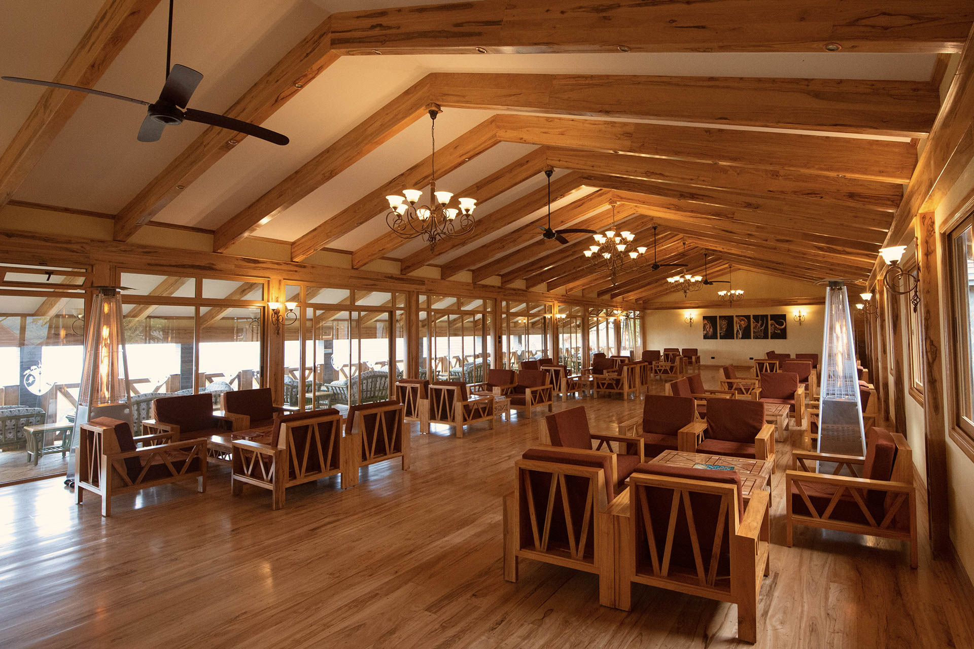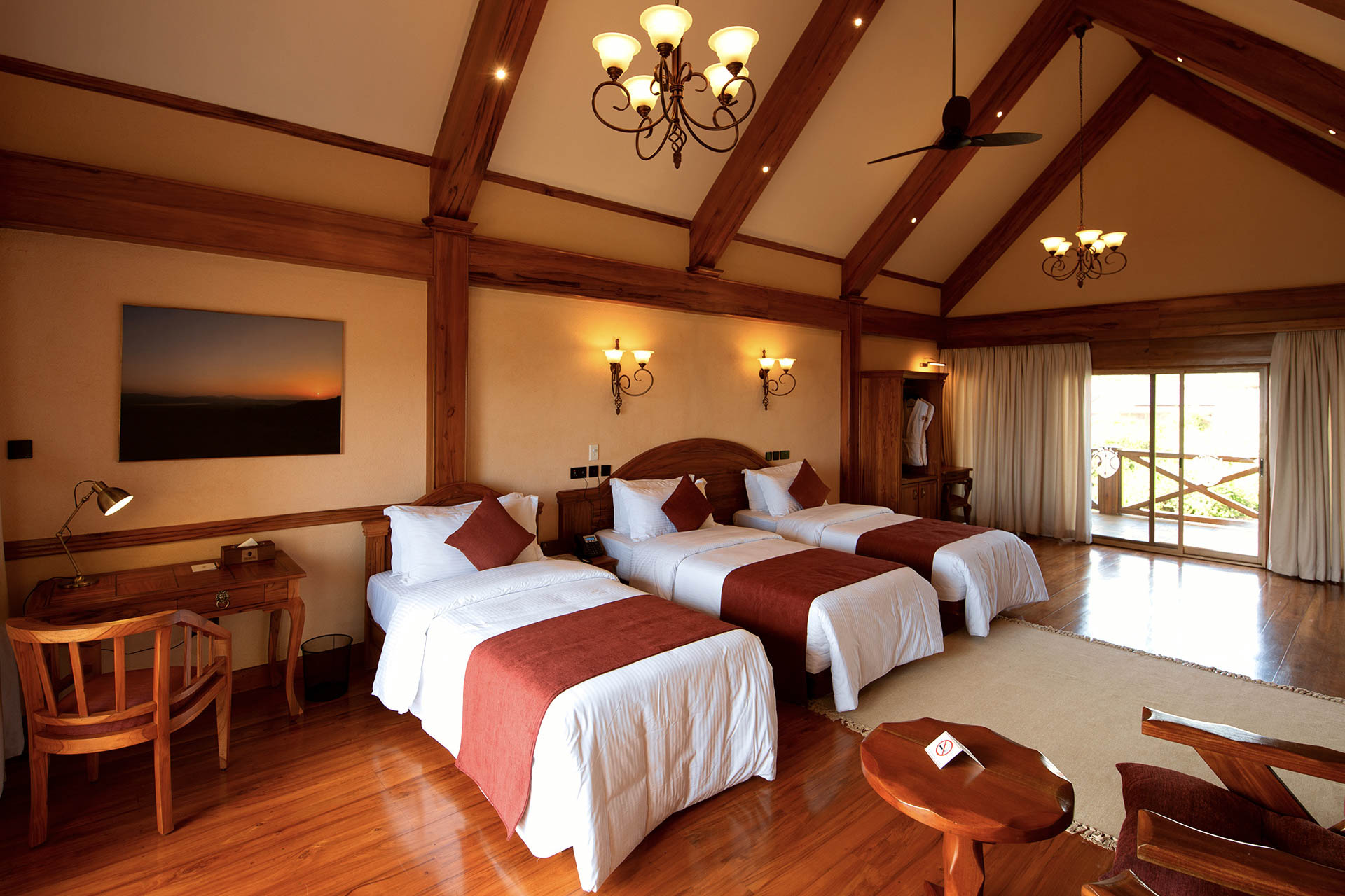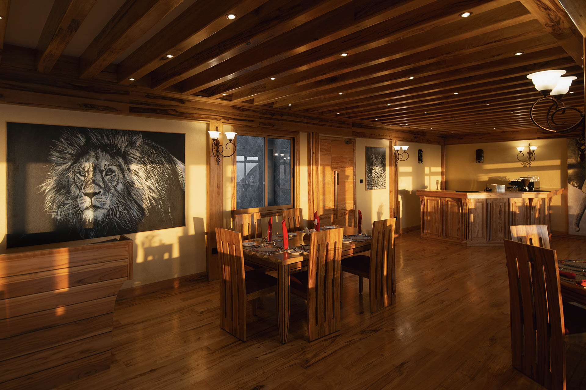 Die Zimmer sind mit Teakmöbeln hochwertig ausgestattet und auf Komfort ausgelegt. Große Fenster öffnen den Blick in den Ngorongoro Krater und die grünen Hügel des Hochlandes. Innen dominieren klare Linien und warme Farbtöne, die eine angenehme Atmosphäre schaffen. Die öffentlichen Bereiche bieten ausreichend Platz zum Entspannen und eignen sich gut, um nach einem Safari-Tag die Aussicht zu genießen.